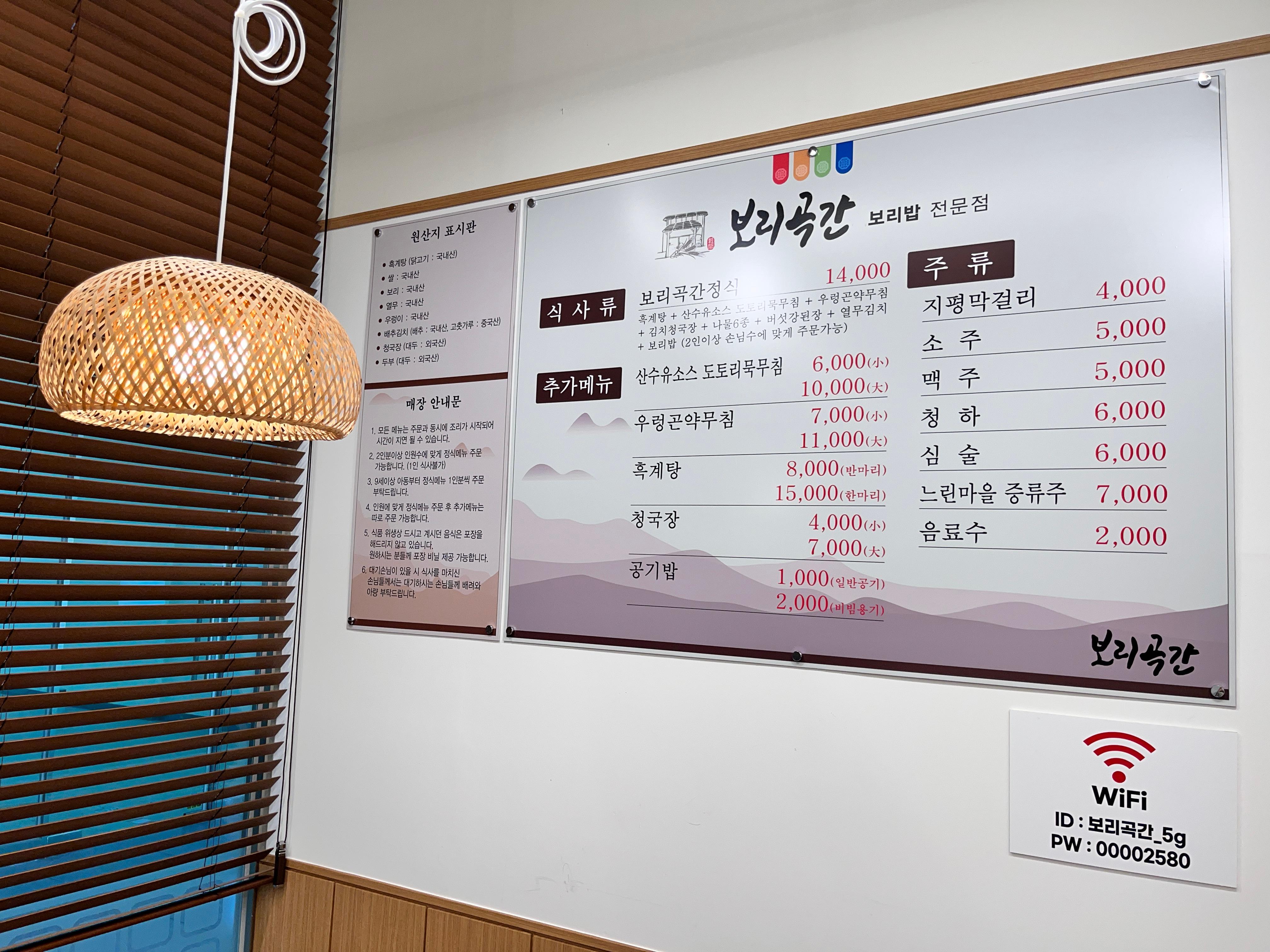메뉴판은 간단합니다. 대표 메뉴인 보리곡간 정식(14,000원)이 전부예요.